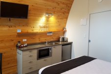 They are open plan with queen bed and sofa, kitchen with a microwave, bathroom and TV.